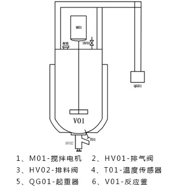 攪拌電機、排氣閥、排料閥、溫度傳感器、起重器、反應釜、視鏡、智能儀表、空氣開(kāi)關(guān)等電氣、嵌入式一體化彩色觸控顯示屏。