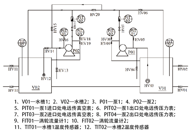 離心泵、電遠傳真空表、電遠傳壓力表、渦輪流量計、溫度傳感器、閥門(mén)管路若干、智能儀表、嵌入式一體化彩色觸控顯示屏。