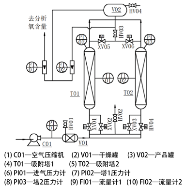不銹鋼吸附塔、電磁閥、無(wú)油空氣壓縮機、干燥罐、產(chǎn)品罐、氧分析儀、智能儀表、嵌入式一體化彩色觸控顯示屏。